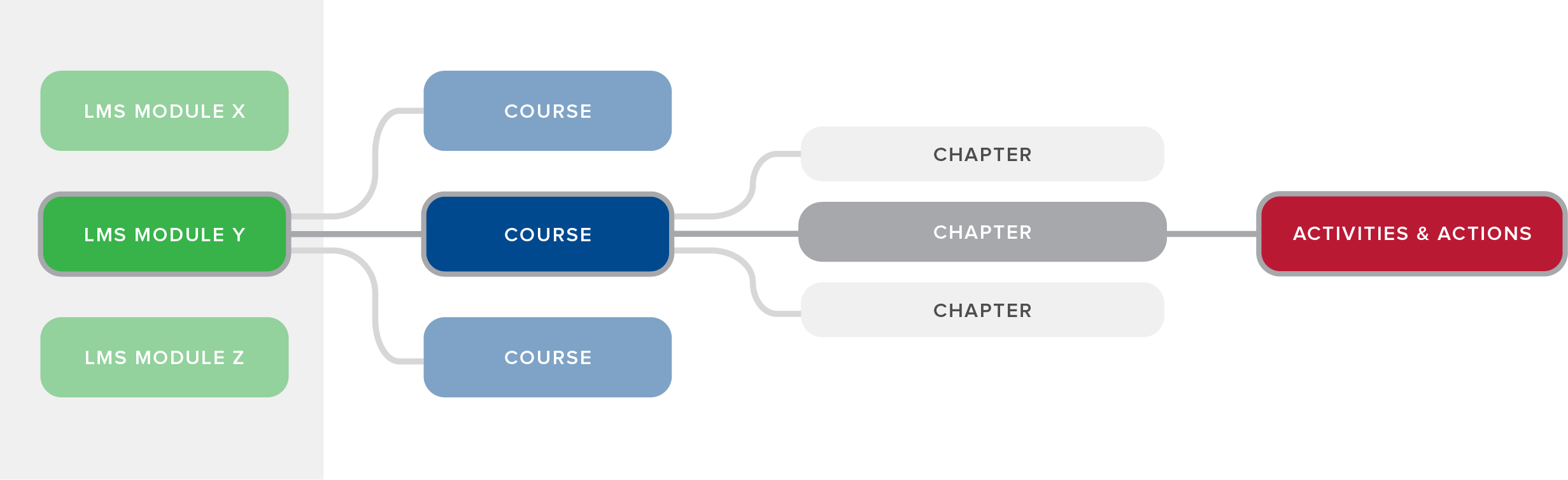 GZ Learn modules can be structured in one of three ways. Once you choose an option, it is not possible to omit any of the levels within its hierarchy. However, there can be any number of "children" within each "parent" element in the hierarchy. For example, if choosing the Full Structure module, it must include at least one course, one chapter, and associated activities and actions, but can contain as many of each as needed.